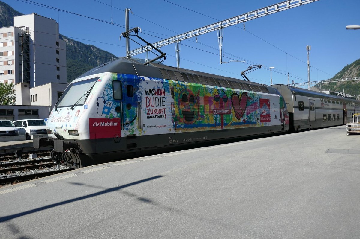 Die Re 460 099 mit der Gottardo 2016 / Die Mobiliar Werbung am Morgen des 16.7.2016 im Bhf Brig.