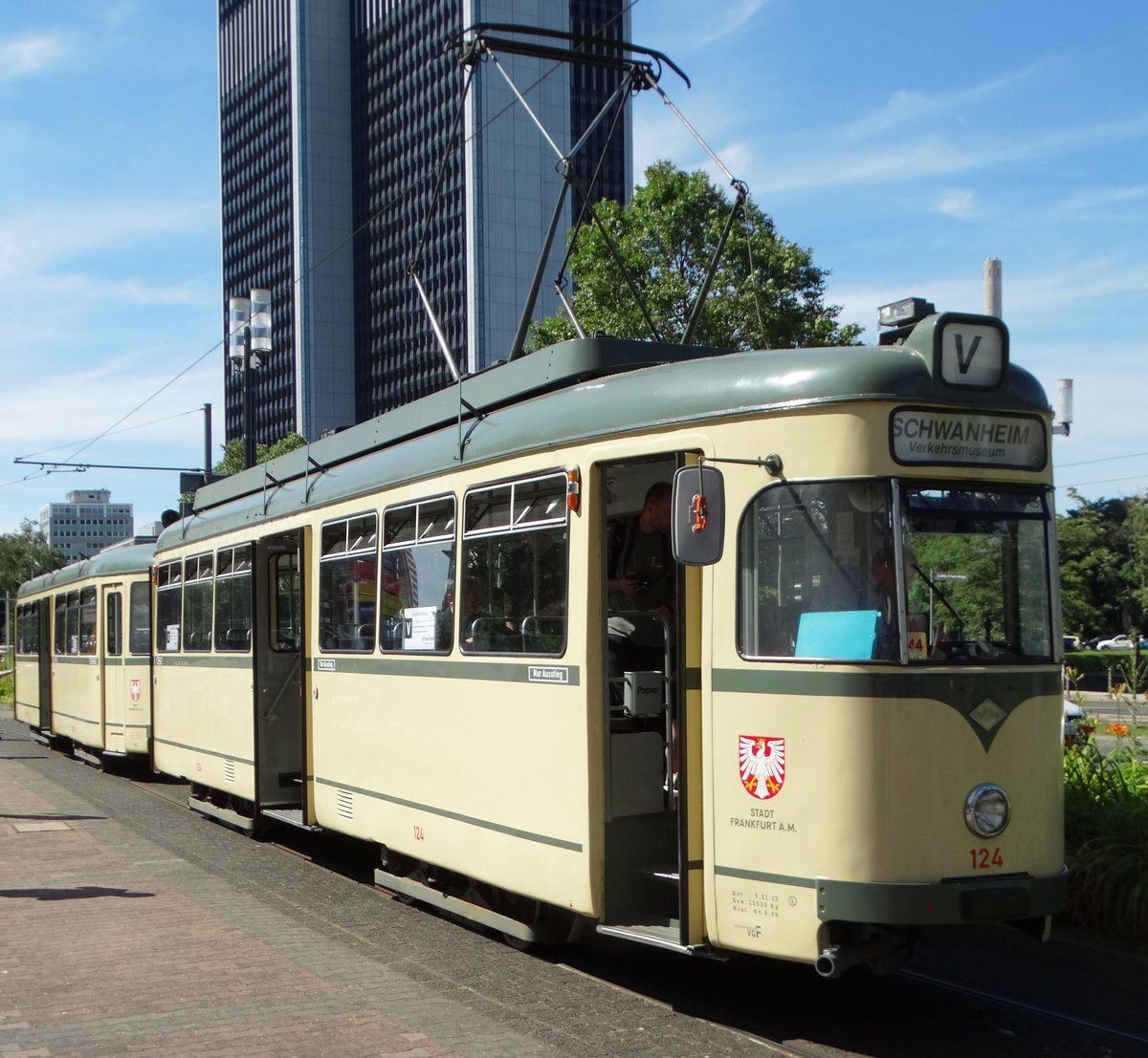 VGF Düwag L-Wagen 124 am 10.07.16 in Frankfurt Messe als Pendelverkehr zum Sommerfest im Verkehrsmuseum