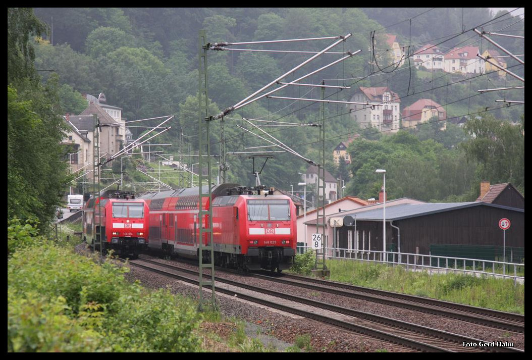 Am 25.05.2016 kam 146025 bei Nieselregen das Elbtal herauf. Um 9.42 Uhr war kam sie mir am Ortsrand von Königstein in Richtung Bad Schandau vor die Kamera.