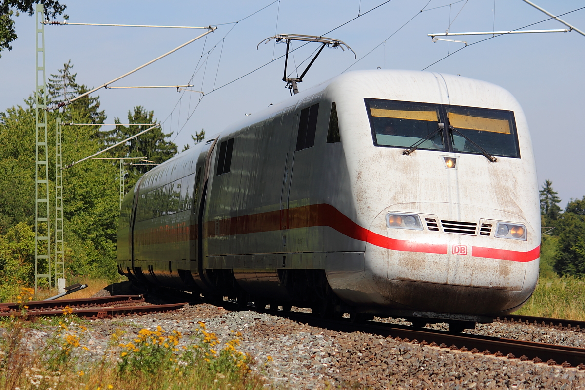 Wegen einer baustellenbedingten Streckensperrung zwischen Solingen und Opladen wird der Wuppertaler Teil der ICEs Berlin - Köln von Wuppertal über Düsseldorf statt Solingen nach Köln geführt. So kommt auch die BR 402 auf die Erkrather Rampe. Im Bild 402 024 als ICE 652 Berlin - Köln bei Erkrath (18.7.16).