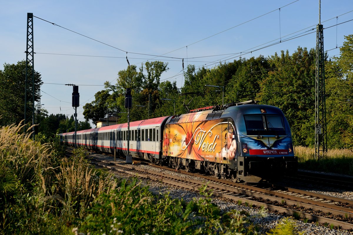 Am 30. August 2013 war EC 189 von München nach Innsbruck mit der Wagner/Verdi-Lok 1216 019 bespannt. Im schönen spätsommerlichen Abendlicht gelang diese Aufnahme bei der Durchfahrt durch den Bahnhof Assling.