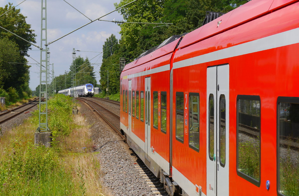WSegen der Sperrung der KBS 455 zwischen Solingen und Opladen ist die RE 7 während der Sommerferien gebrochen in einen Pendelverkehr Krefeld - Köln-Deutz und einen Linienweg Düsseldorf - Wuppertal - Hamm - Rheine. Eine Talent 2-Doppeltraktion (vorn ET 359) passiert Erkrath auf dem 3. Gleis und hat in wenigen Minuten Düsseldorf Hbf erreicht (18.7.16).