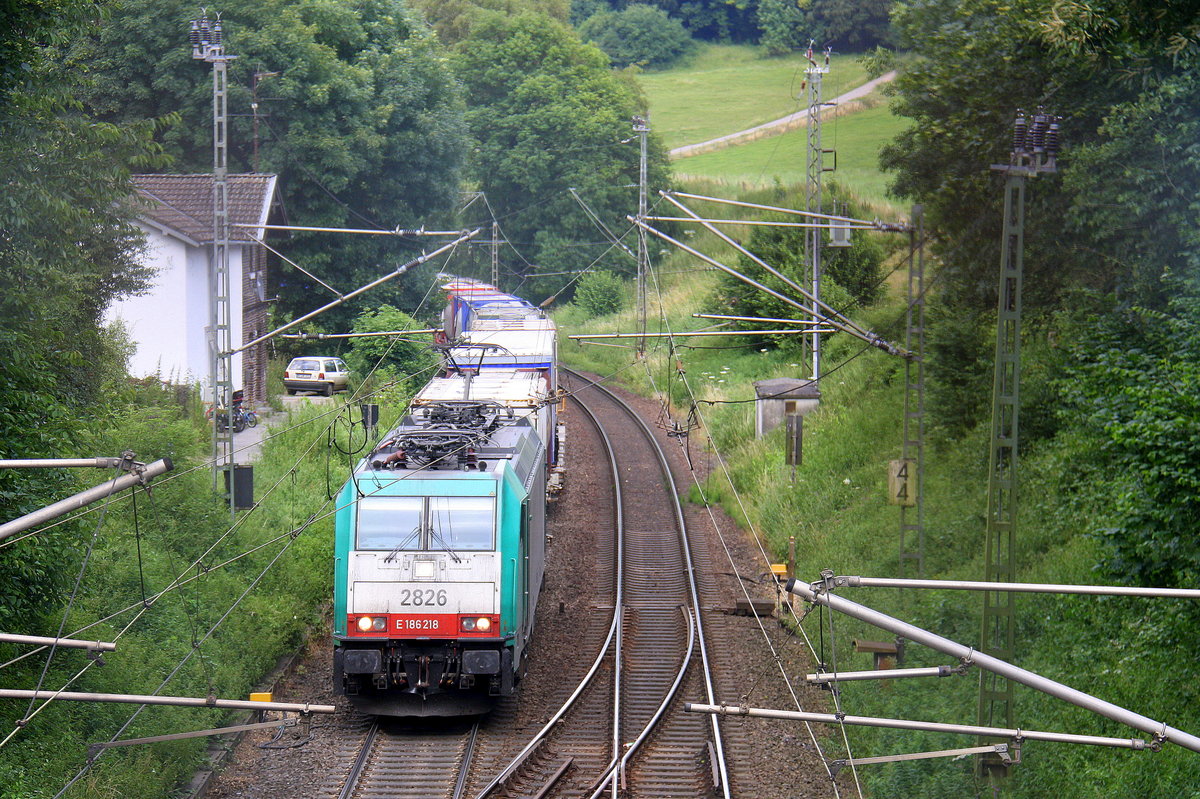Die Cobra 2826 kommt die Gemmenicher-Rampe hochgefahren aus Aachen-West mit einem Containerzug aus Gallarate(I) nach Antwerpen-Oorderen(B) und fährt gleich in den Gemmenicher-Tunnel hinein und fährt in Richtung Montzen/Vise(B).