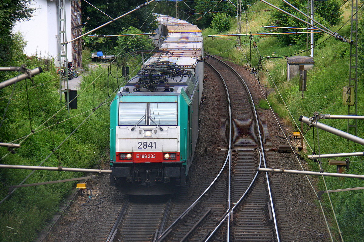 Die Cobra 2841 kommt die Gemmenicher-Rampe hochgefahren aus Aachen-West mit einem Containerzug aus Novara(I) nach Genk-Zuid-Haven(B) und fährt gleich in den Gemmenicher-Tunnel hinein und fährt in Richtung Montzen/Vise(B).
