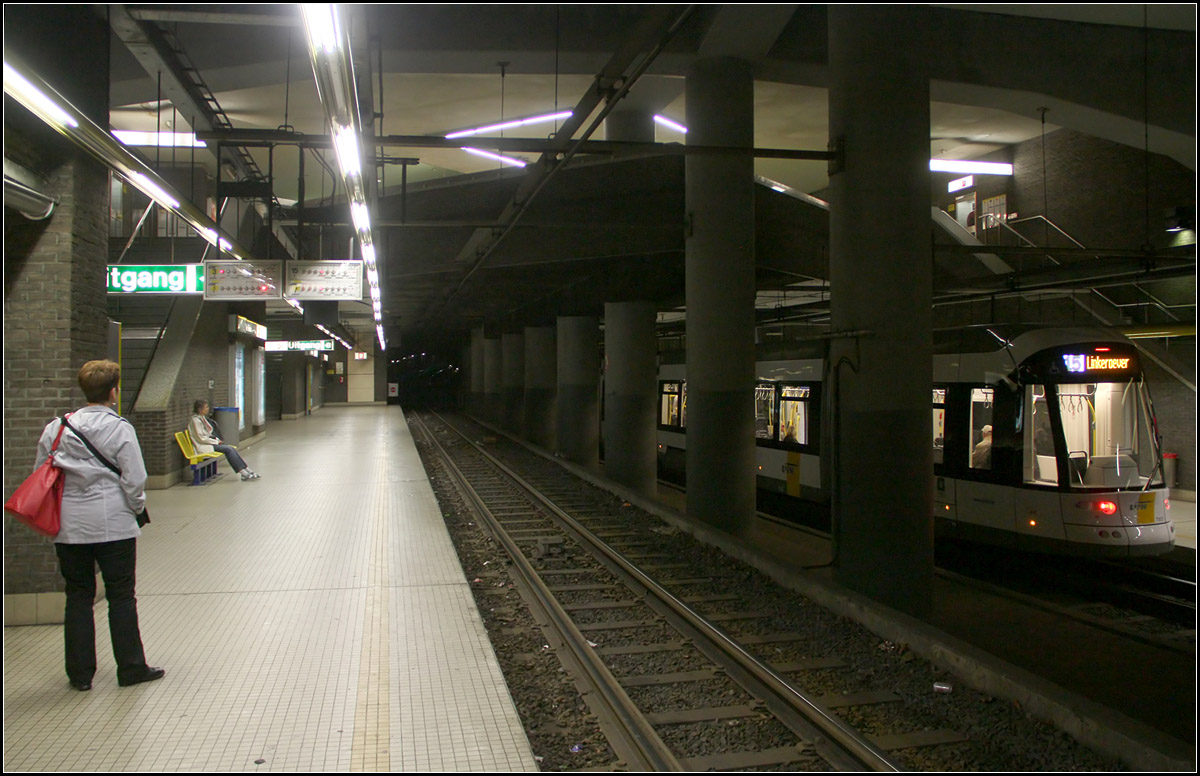 Die Bahnsteigebene der Pre-Metro Station Van Eden auf dem Linkerover in Antwerpen. Der Tunnel unter der Schelde mit dieser U-Station ging 1990 in Betrieb. Im Gegensatz zu vielen Pre-Metro Stationen liegen hier die Gleise nicht übereinander.