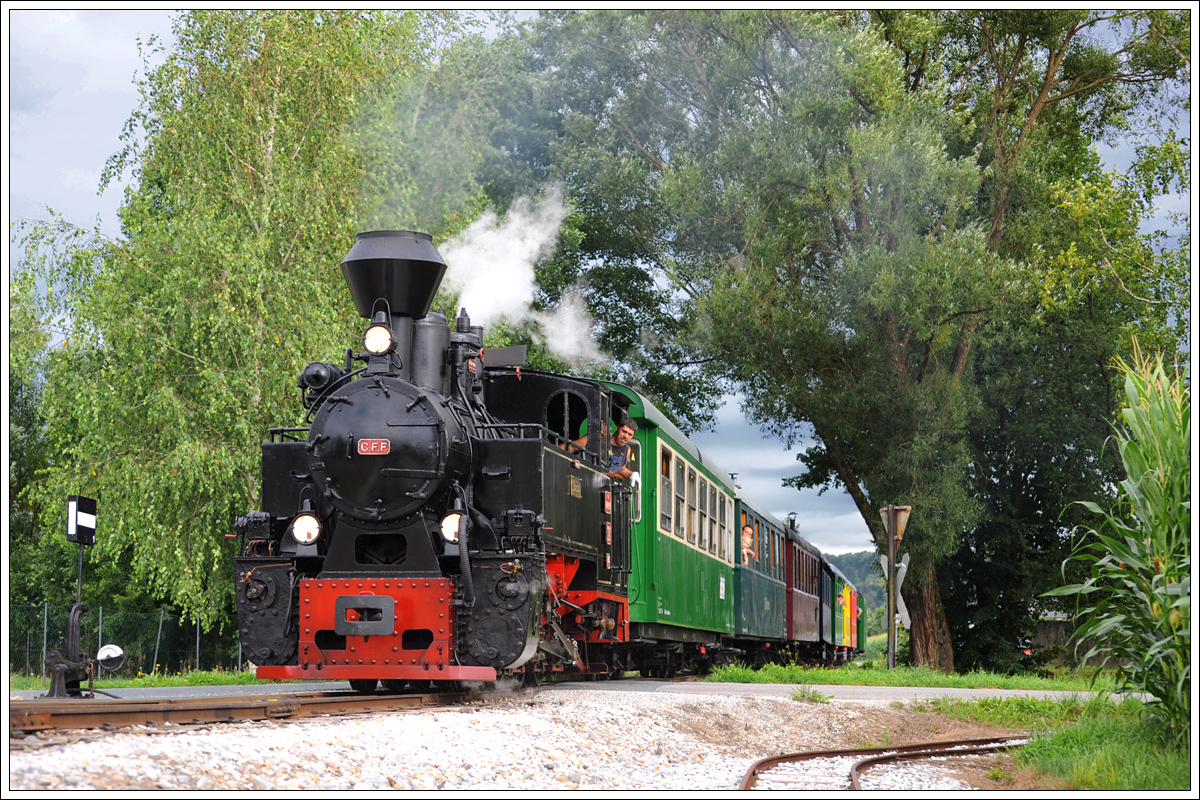 Es hat leider die Sonne im Rücken gefehlt, die Wolkenstimmung im Stainztal war am 17.7.2016 teilweise genial. Die Aufnahme entstand bei der Durchfahrt der Haltestelle Neudorf/Stainztal.