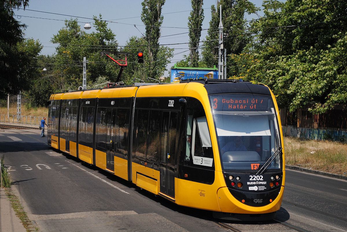 CAF Urbos 2218 nähert sich als Linie 3 der Haltestelle Eles Sarok. (12.07.2016)