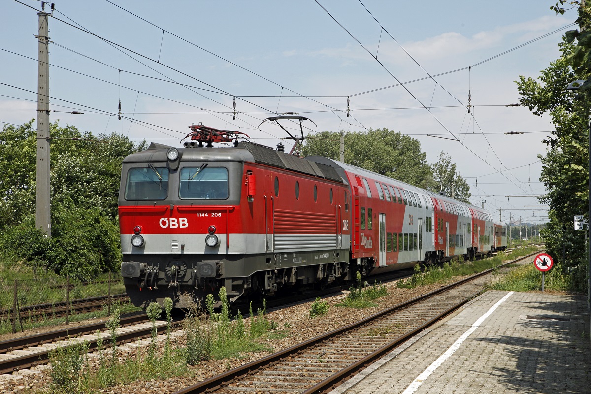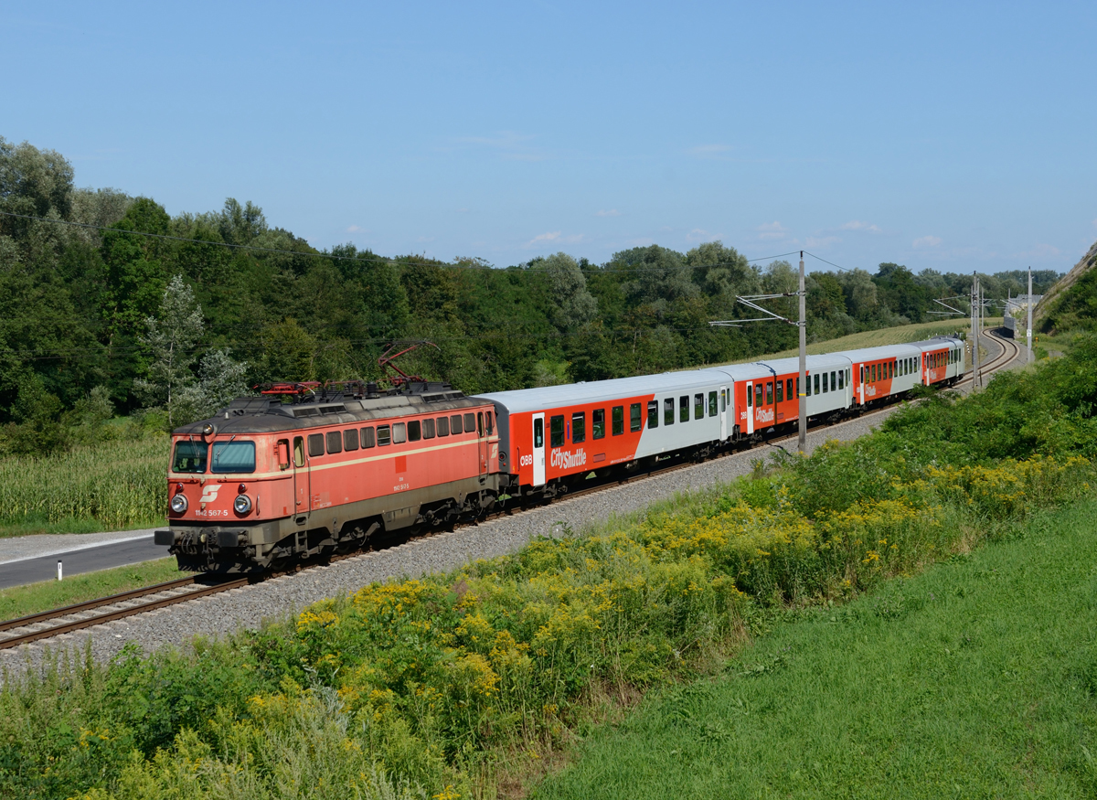 Die blutorange 1142 567 war am Nachmittag des 29. Juli 206 mit einer CityShuttle Garnitur vor Spielfeld-Straß nach Graz Hauptbahnhof unterwegs, und wurde von mir bei Ehrenhausen fotografiert.
