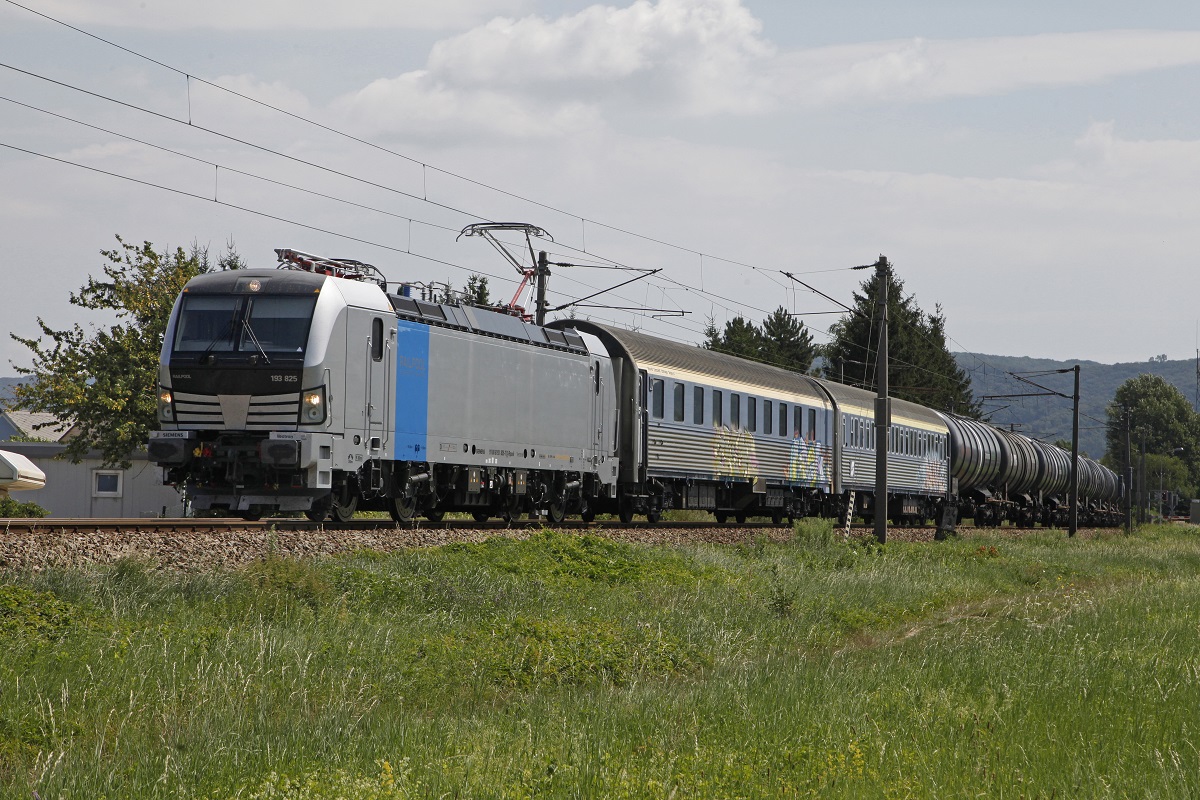 193 825 mit Güterzug knapp vor der Haltestelle Zeiselmauer - Königstetten am 29.07.2016.