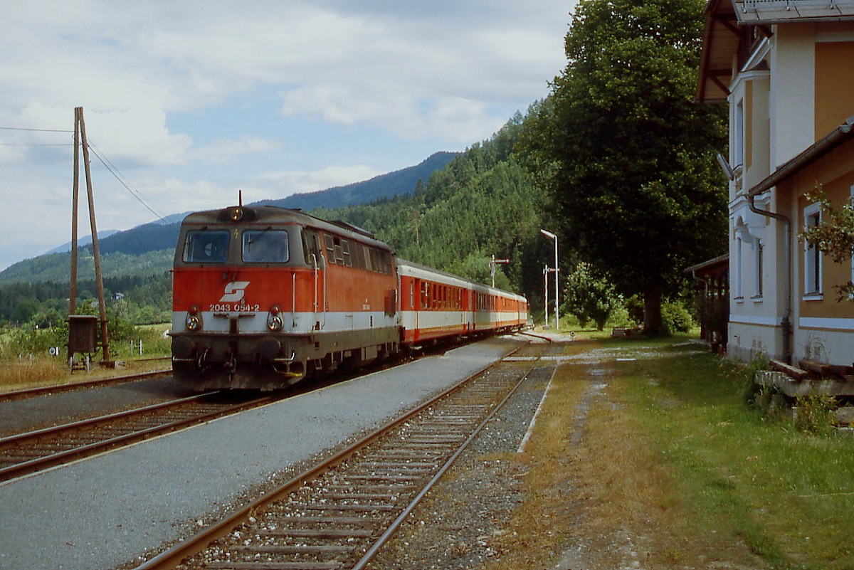 2043 054-2 trifft im Sommer 2000 mt einem Regionalzug im Bahnhof Feistritz im Rosental ein