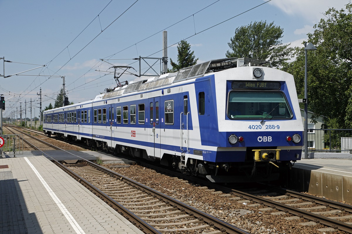 4020 288 erreicht soeben die Haltestelle Muckendorf - Wipfing. Das Bild endstand am 29.07.2016.