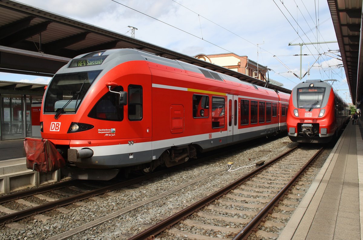 429 529-1 wartet als RE9 (RE13009) von Rostock Hauptbahnhof nach Sassnitz zusammen mit 442 844-7 als S3 von Warnemünde nach Güstrow am 28.7.2016 im Rostocker Hauptbahnhof.