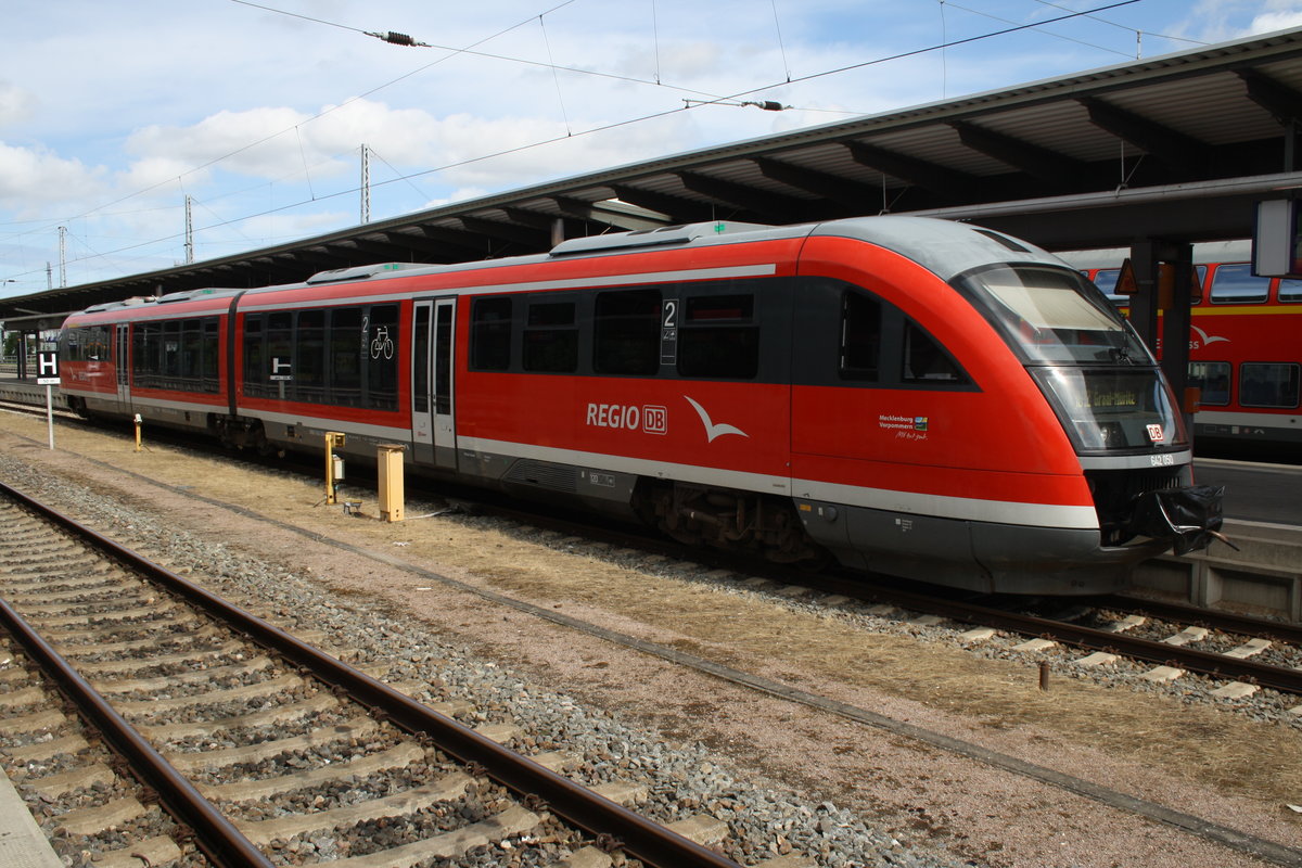 642 050-8 steht am 28.7.2016 als RB12 (RB13235) nach Graal-Müritz im Rostocker Hauptbahnhof.