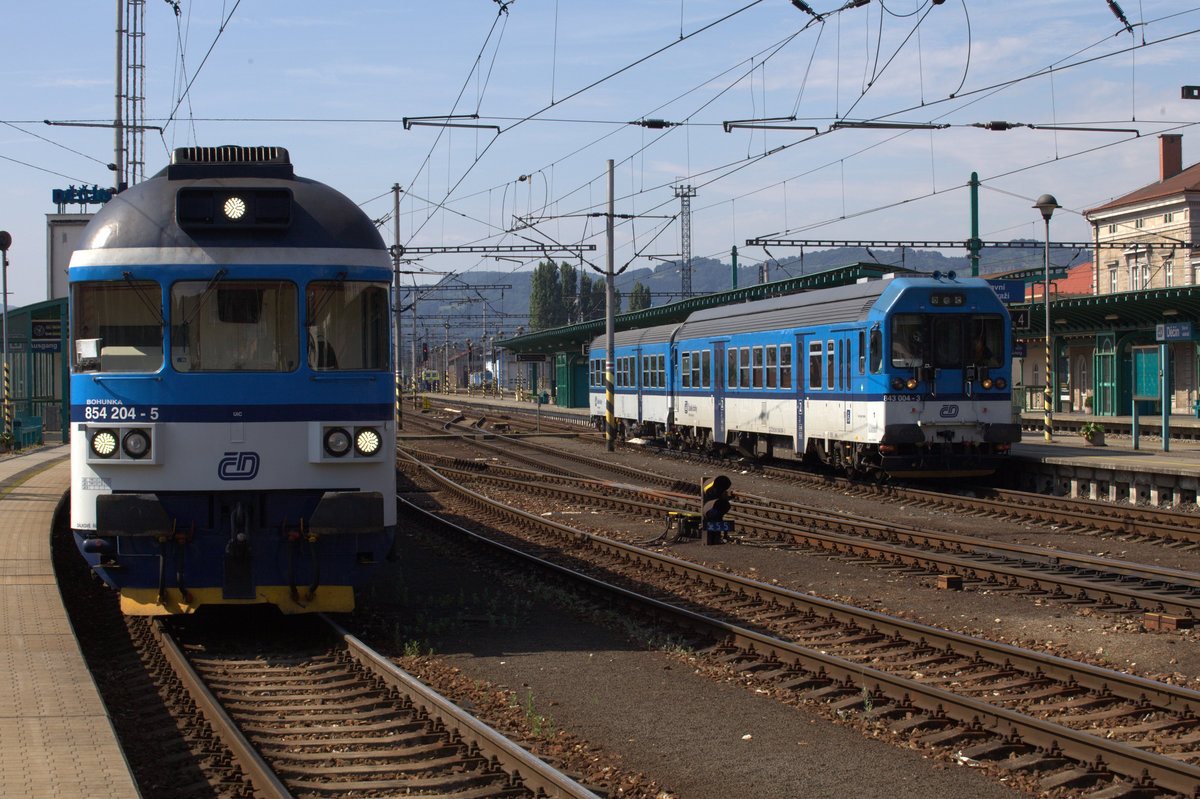 852 204 -5 "Bohunka" und 843 004-3 abfahrbereit in Decin hln. Bohunka wird den Fotografen nach Ceska Kamenice bringen.02.07.2016 10:04 Uhr.