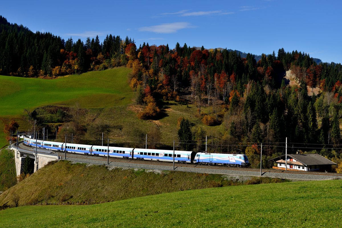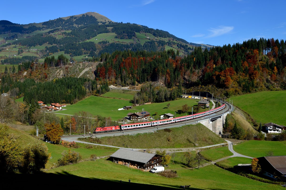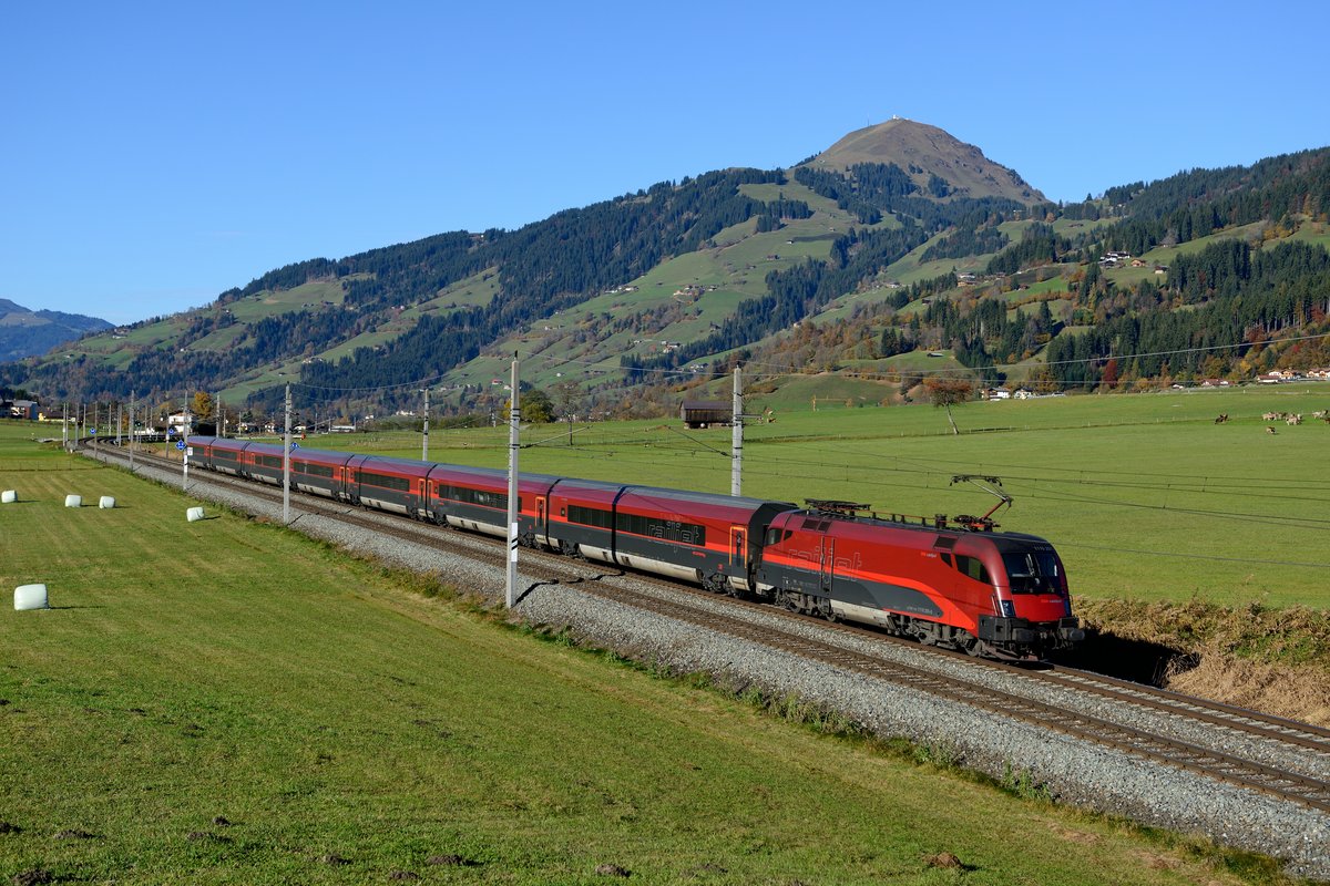 Normalerweise nicht auf der Giselabahn zu beobachten: Die RailJet Züge der ÖBB. Aufgrund der Sperre des Korridors am Wochenende des 26. und 27. Oktober 2013 nahmen auch die österreichischen Hochgeschwindigkeitszüge den längeren Weg über Schwarzach-St.Veit. Hier ist SO-RJ 31364 von Salzburg nach Sargans mit der 1116.209 bei Brixen im Thale unter der beeindruckenden Kulisse der Hohen Salve zu sehen.