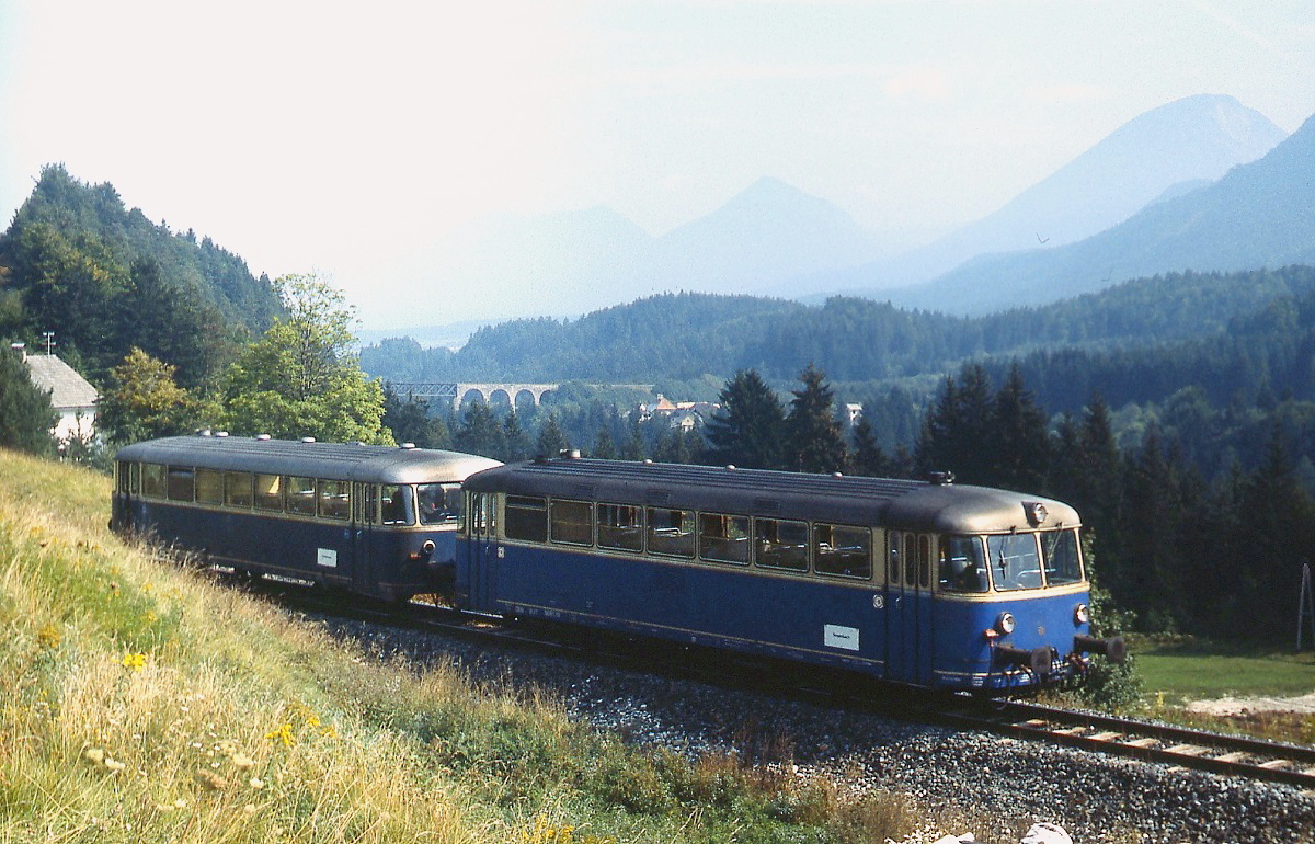 Am 09.09.1981 fährt eine 5081-Garnitur von Klagenfurt kommend in den Bahnhof Rosenbach ein. Über dem Triebwagen ist der Rosental-Vadukt erkennbar.