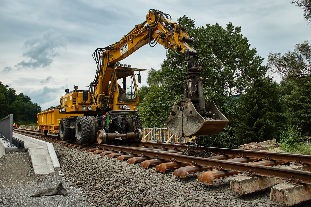 Am 29.07.16 ist ein Bagger mit Hänger beim Schottern der Gleise auf der Sanierten Brücke bei Wasungen/Thür. zu sehen.