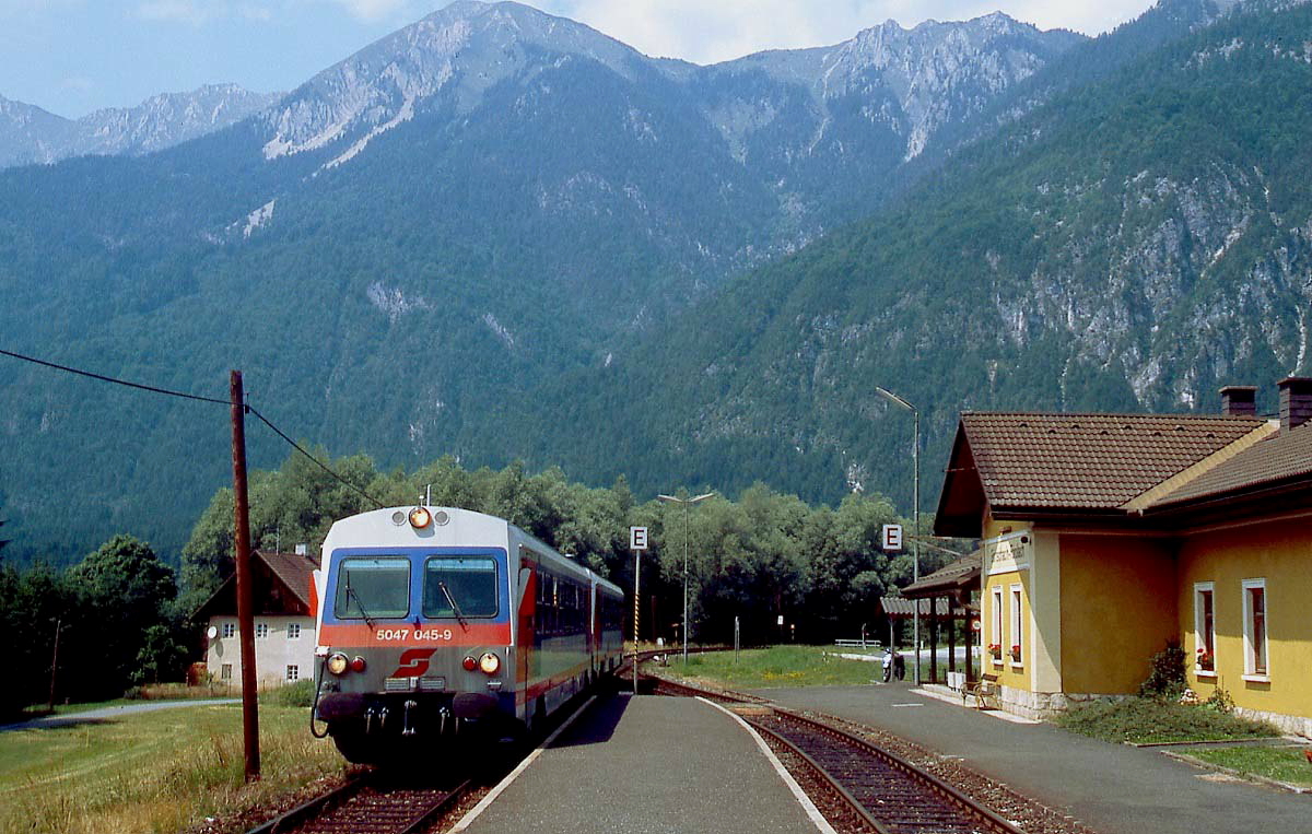 Auf dem Weg von Hermagor nach Villach fährt 5047 045-9 mit einem weiteren 5047 im Sommer 2000 in Görtschach-Förolach ein
