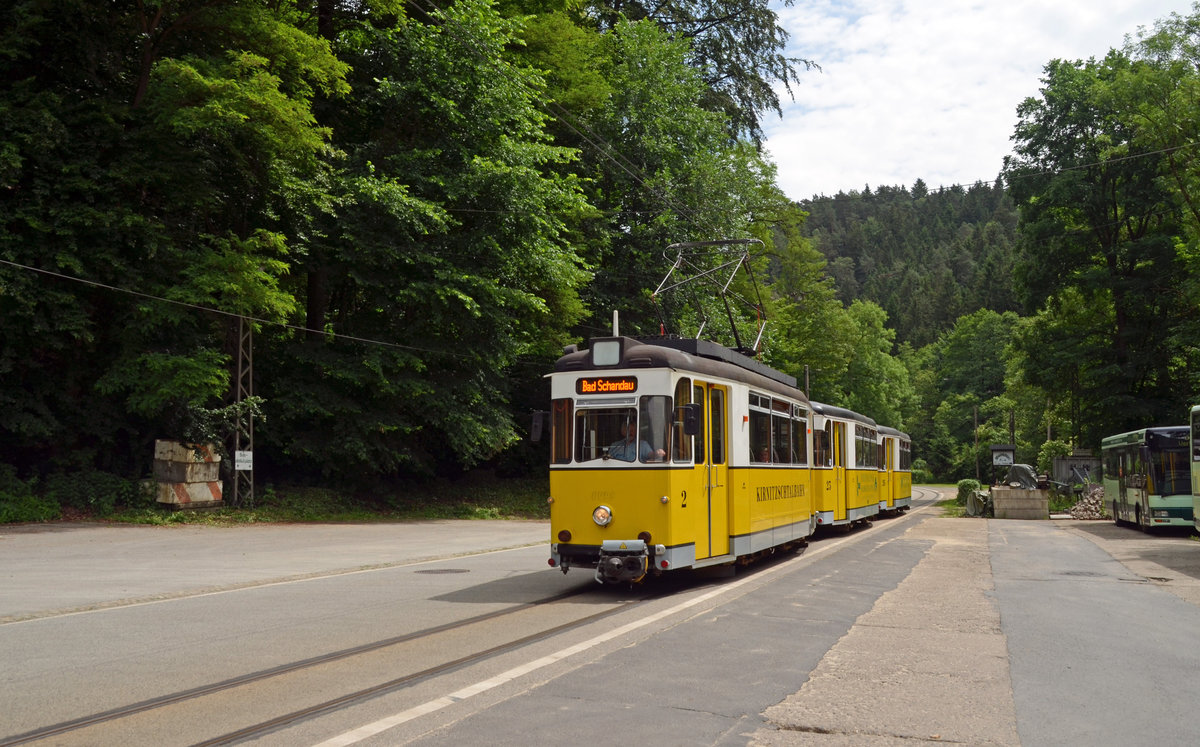 Eine Bahn der Kirnitzschtalbahn erreicht am 16.06.16 den Haltepunkt Botanischer Garten. Die Bahn war unterwegs vom Kurpark Bad Schandau zum Lichtenhainer Wasserfall.
