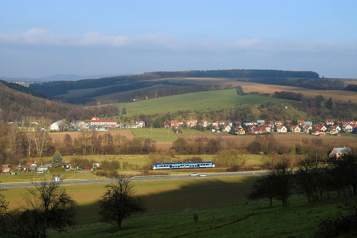 Die neuen Triebzüge der CD trägen nun Namen einiger Tiere, die normaleweise nur im Tiergarten zu sehen sind, wie auch die Baureihe 844, das RegioShark. 844.014 verlässt am 28.11.2015 den Ortshaft Želechovice nad Dřevnicí als Os 14224 von Vizovice nach Otrokovice.