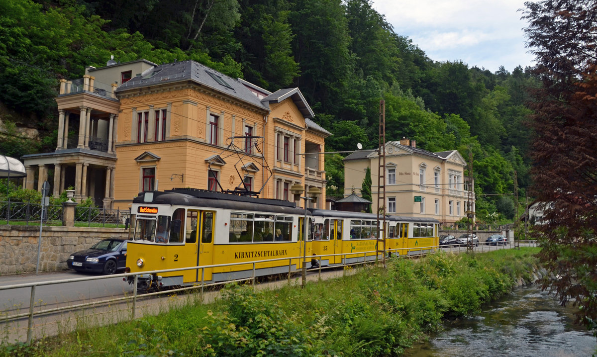 Vom Kurpark Bad Schandau aus fährt die Kirnitzschtalbahn alle 30 Minuten entlang der Kirnitzsch. Am 16.06.16 hat eine Bahn bereits den Ausgangspunkt verlassen und passiert hier auf dem Weg zum Endpunkt den Bad Schandauer Kurpark.