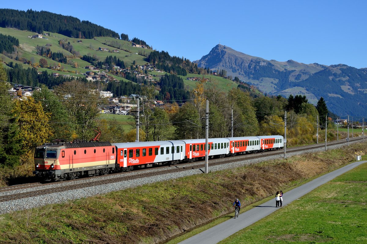 Das Fotografieren an der landschaftlich schönen Giselabahn macht einfach Laune - wenn nur dichterer Zugverkehr wäre...Am Wochenende war aufgrund des Umleiterverkehrs deutlich mehr geboten, auch einige Güterzüge rollten, die Aufnahmen derselbigen fielen aber meist den Standortwechseln zum Opfer. Schon fast im Ortsgebiet von Kitzbühel entstand am 26. Oktober 2013 diese Aufnahme vom umgeleiteten SO-IC 30865 von Innsbruck nach Wien Westbahnhof, geführt von 1116.031. Im Hintergrund die beeindruckende Kulisse des Wilden Kaisers.
