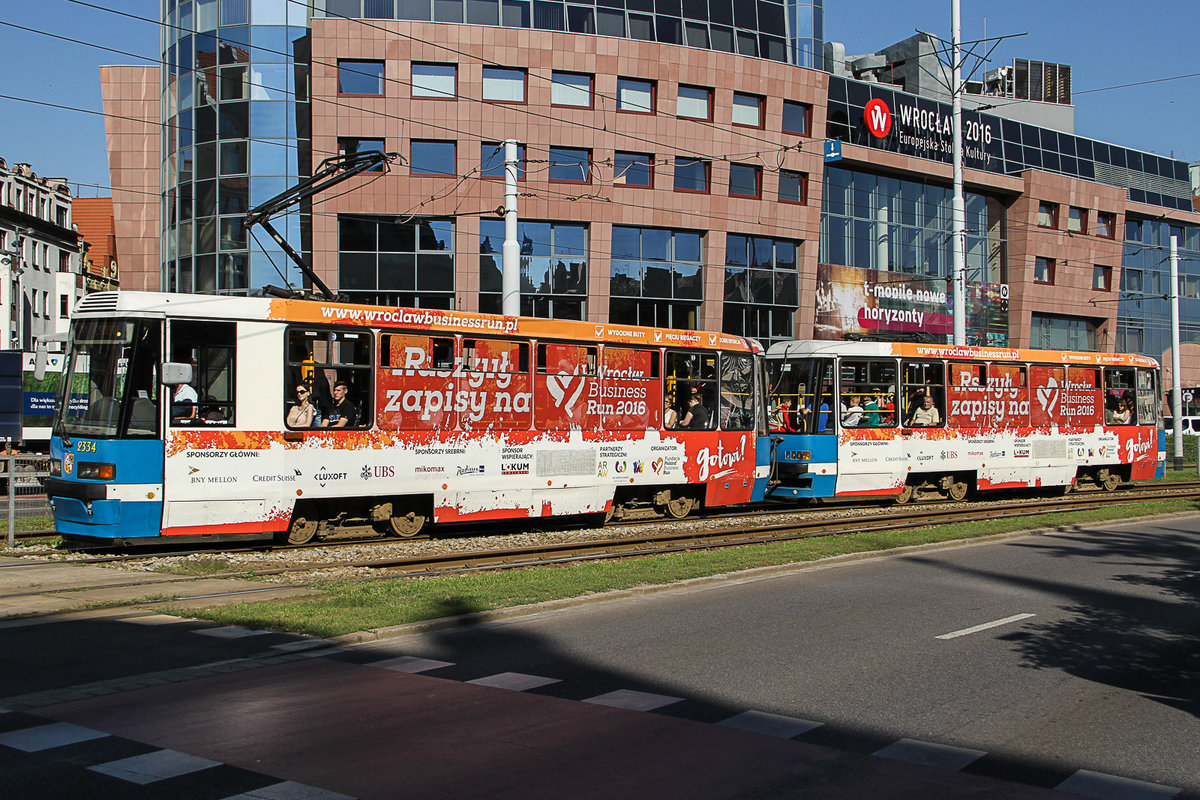 Haltestellen Rynek am 22.07.2016. Wagennummer 2334 fährt bunt durch Wroclaw, der europäische Kulturhauptstadt 2016.