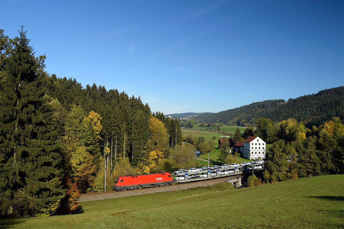 Hinbter Kefermarkt fährt am 24.10.2015 1116.121 mit ihrem Autozug 47491 Richtung Linz und weiter nach Tarvis.