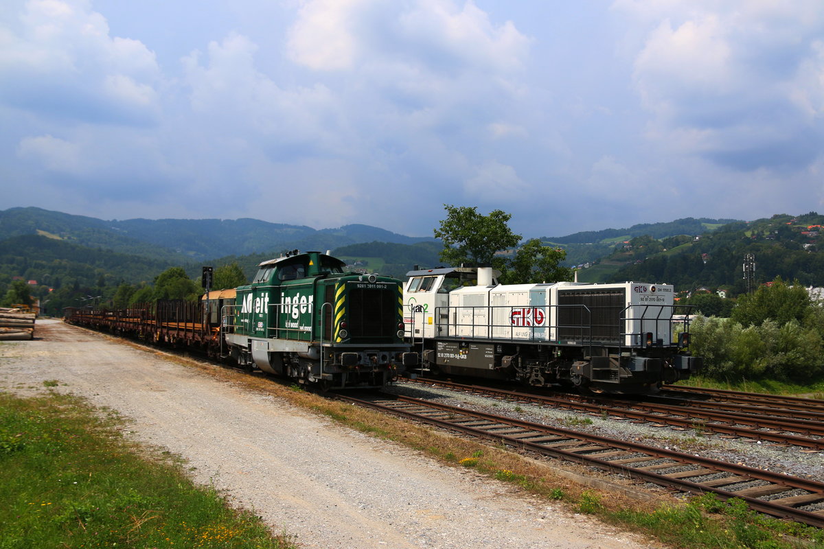 Im Netz der Graz Köflacher Eisenbahn halten sich Werbelokomotiven in Grenzen . Die beiden EX Deutschen V100 ( DH 1100.1 und DH 1100.2 ) Werben für das Ziegelwerk Gleinstsätten und den nicht mehr ganz Aktuellen Holzverarbeiter in Preding. Schneewittchen alias DH1700.2 ex LTE 2170.001 wirbt für Ihr Hauptgeschäft , der Baustelle zur Koralmbahn. In Deutschlandsberg treffen am 27.07.2016 DH 1100.1 und DH1700.2 aufeinander.
