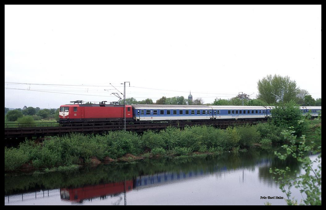Am 16.5.1996 war 143858 bei Roßlau mit dem Dosto RB 5650 um 8.58 Uhr nach Magdeburg unterwegs.