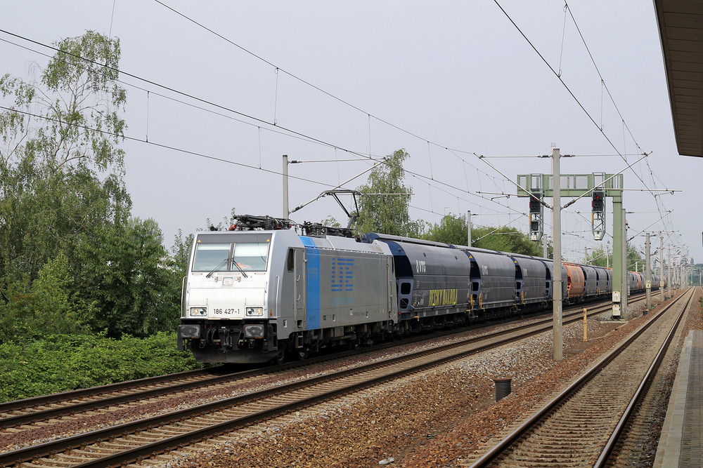 Vom Haltepunkt Dresden-Dobritz aus konnte ich diesen mit LTE 186 427 bespannten Güterzug ablichten.