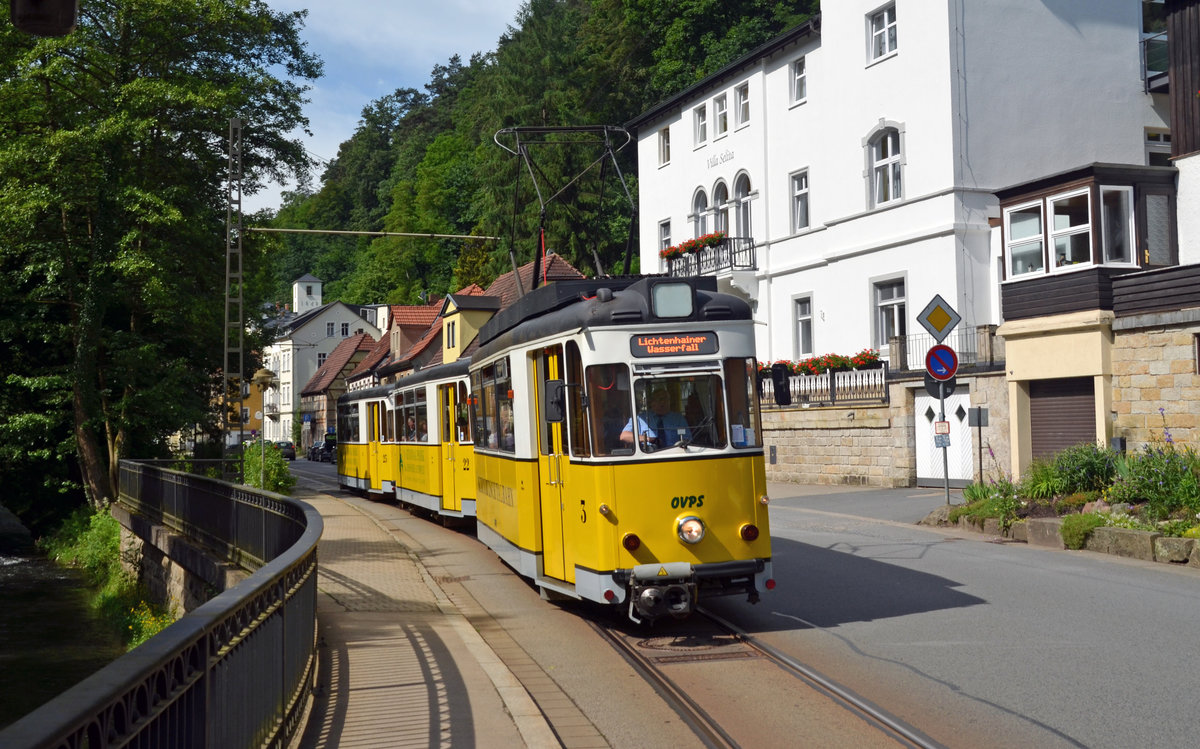 Eine Kirnitzschtalbahn hat am 16.06.16 vom Lichtenhainer Wasserfall aus kommend bereits den Haltepunkt Botanischer Garten verlassen und ist nun auf dem Weg zum Endhaltepunkt Kurpark Bad Schandau.