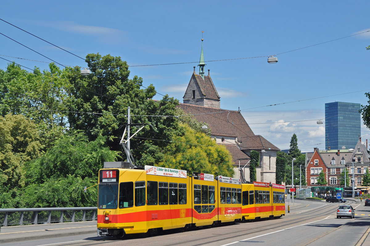 Wegen einer Baustellen bedingten Innerstadt Sperrung wird die Linie 11 über die Wettsteinbrücke umgeleitet. Hier fahren der Be 4/8 243 zusammen mit dem Be 4/6 208 zur Haltestelle Kunstmuseum. Die Aufnahme stammt vom 09.07.2016.
