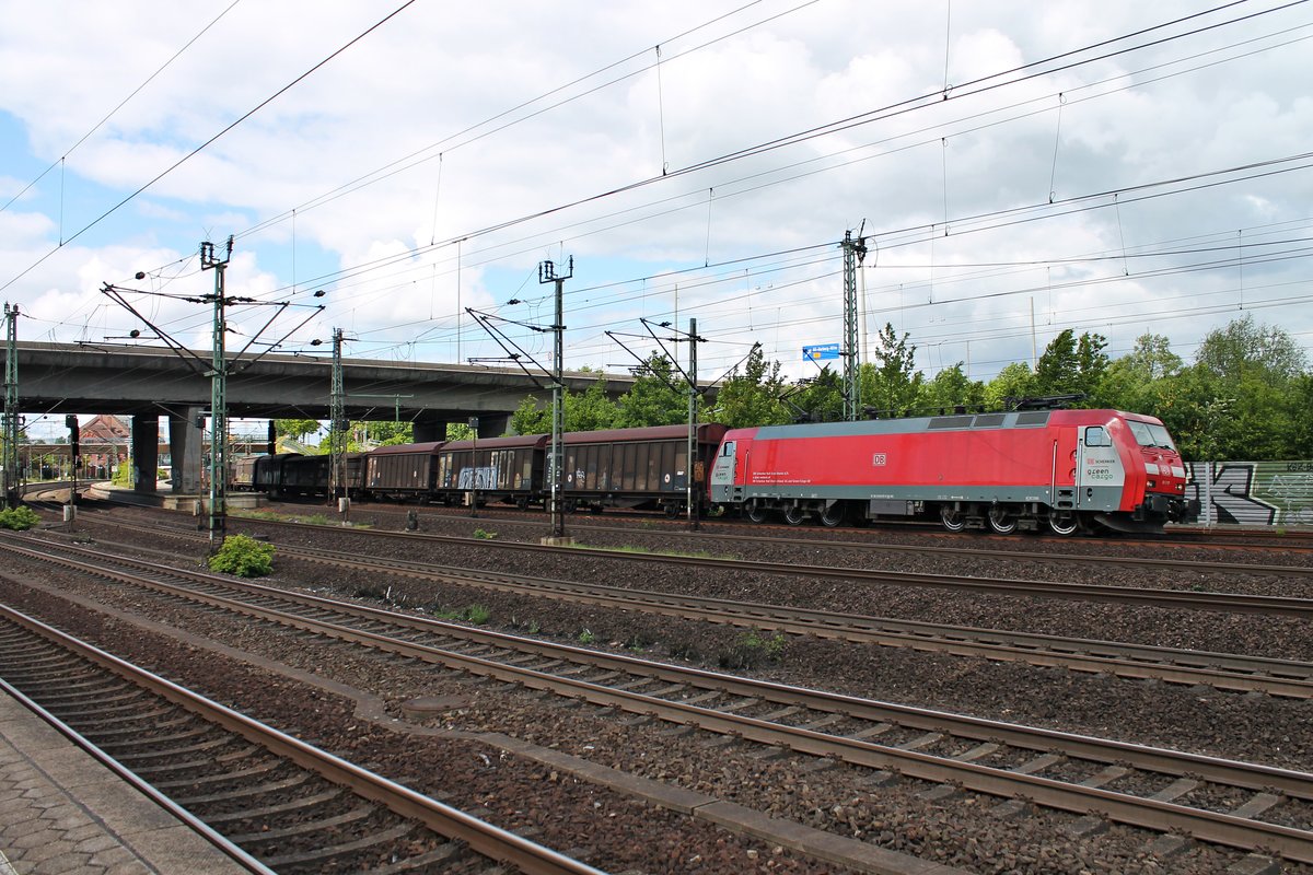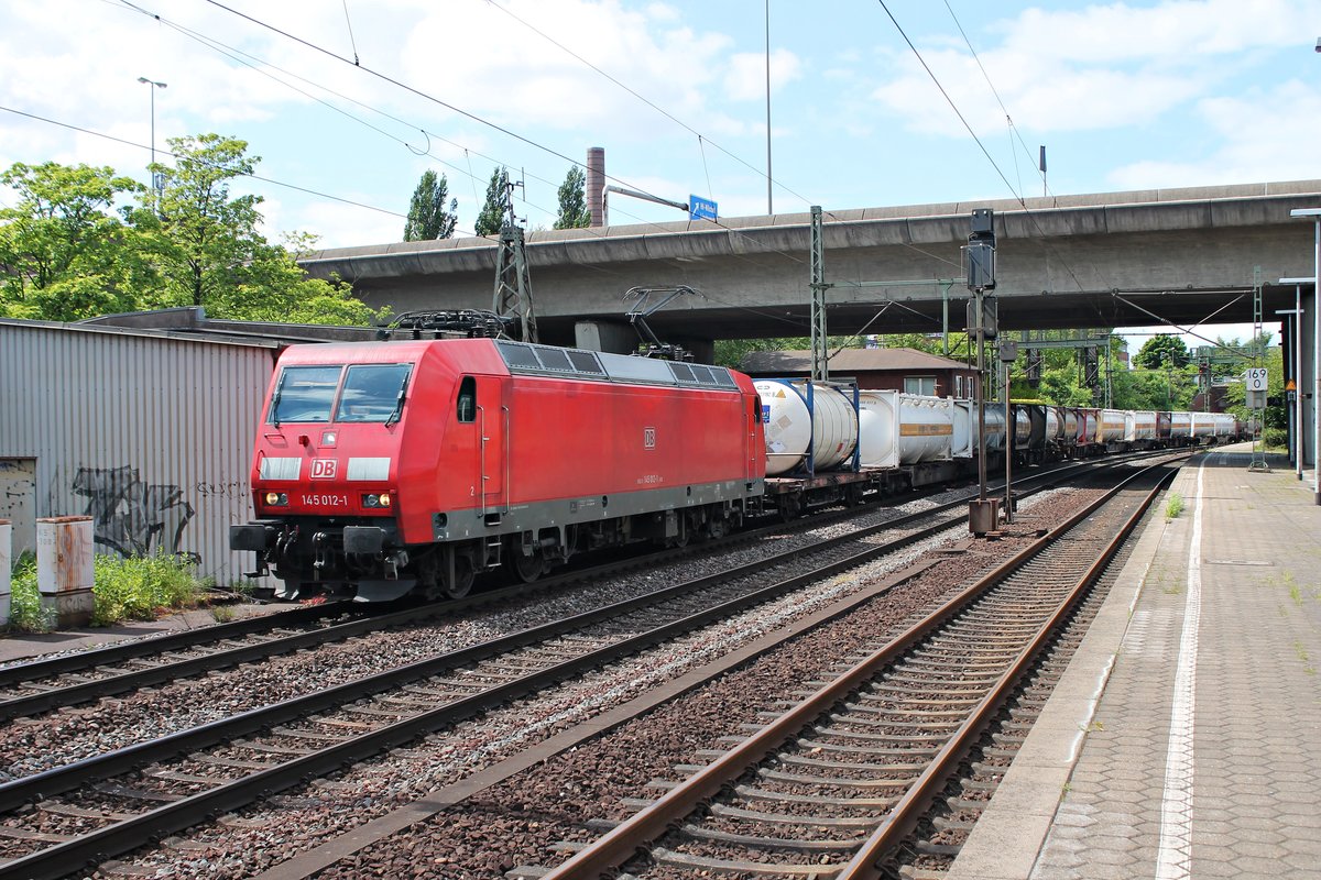 145 012-1 am 26.05.2015 mit einem Containerzug aus dem Hamburger Hafen in Harburg gen Maschen