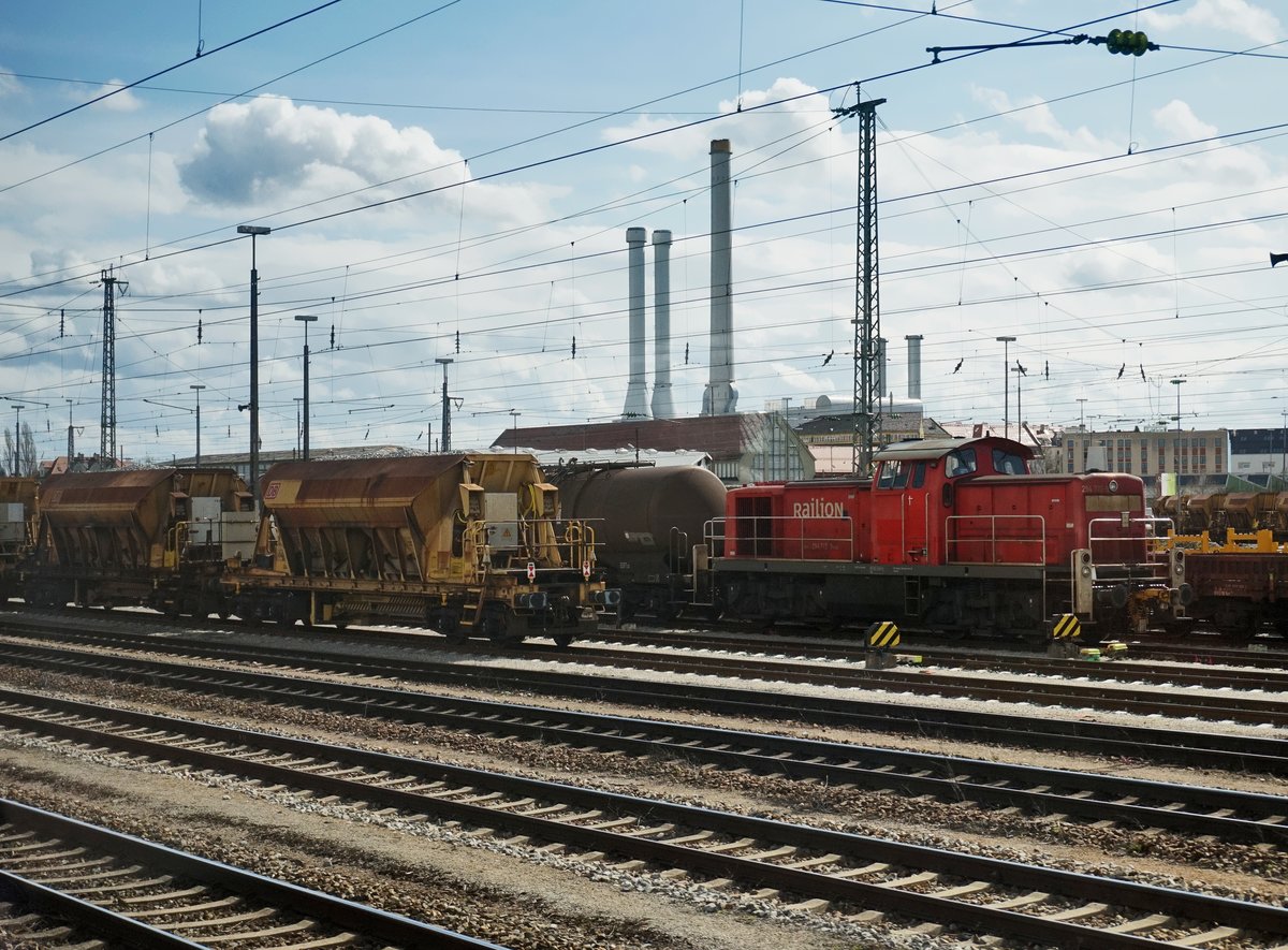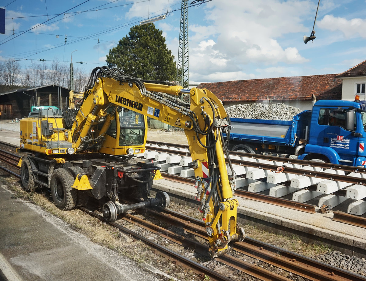 Ein LIEBHERR-Zweiwegbagger am 29.3.2016 im Bahnhof Traunstein.
