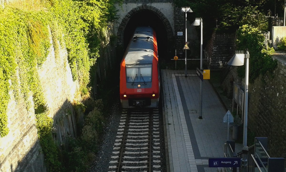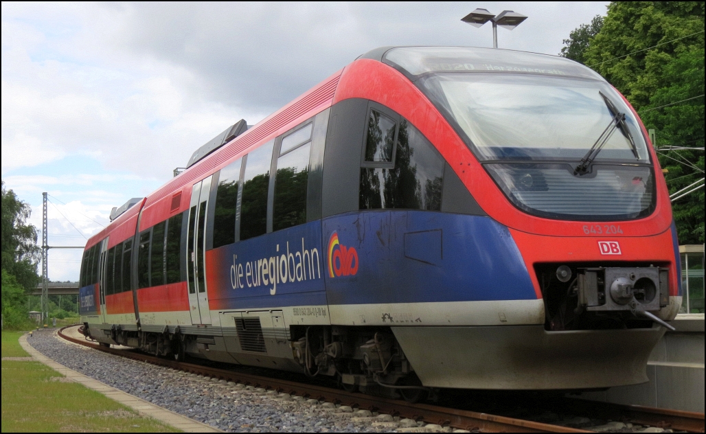Kurzer Halt für den Rhein-Sieg-Express (Hamsterbacke) am Bahnsteig vom Stolberger Bahnhof. Szenario vom 03.Juli 2016.