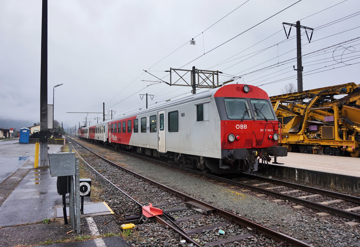 80-73 102-0 am Zugschluss der S1 4262 (Greifenburg-Weißensee - Villach Hbf), am 8.4.2016 im Bahnhof Greifenburg-Weißensee. Zuglok war 1144 285-4