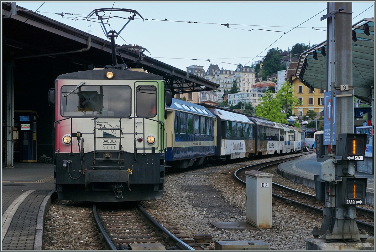 Als Nachtrag zur Fotoserie "40 Jahre Panoramawagen" zeigt dieses Bild gleich hinter der Lok ein farblichen in den Urspungzustand versetzter MOB Panoramwagen im GoldenPass Panoramic 2112 kurz vor der Abfahrt in Montreux.