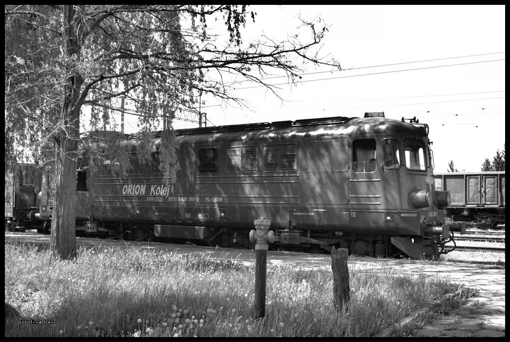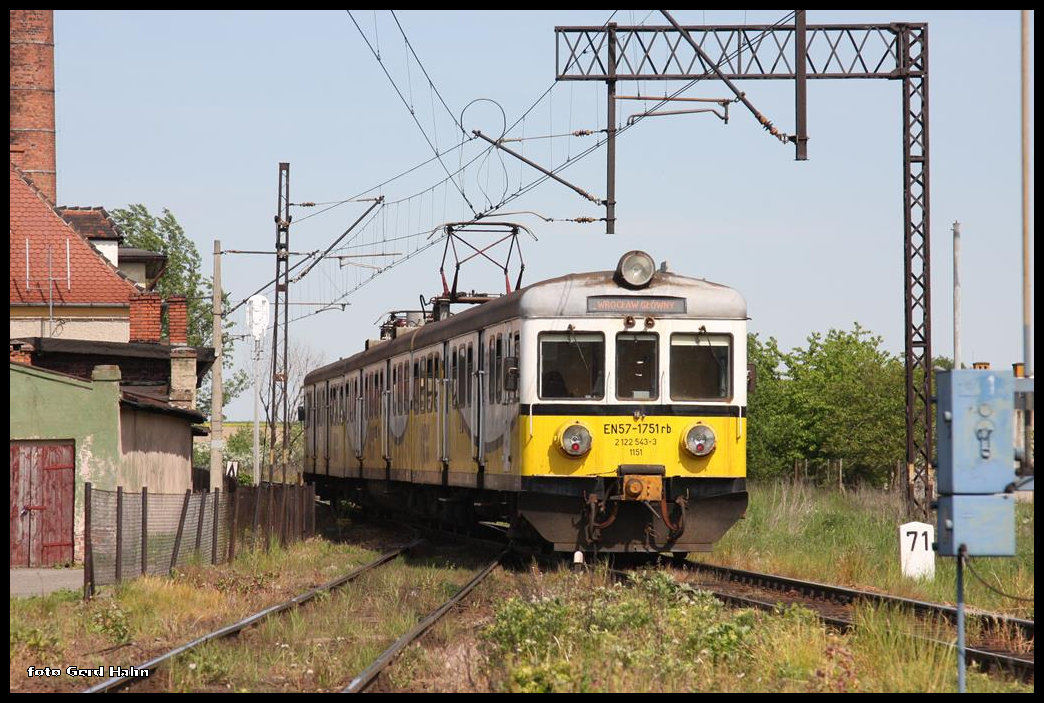 EN57-2335 verlässt in Höhe des Depots am 22.05.2016 den Bahnhof Kamienice Zabkowicki.