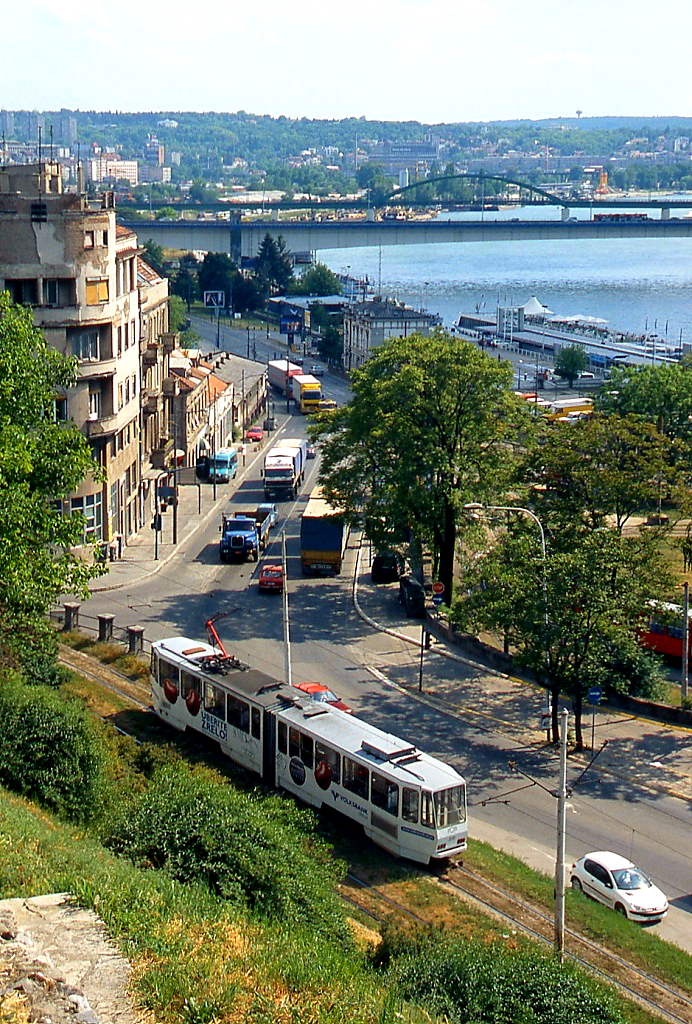 Am 09.05.2009 ist ein KT4 der Belgrader Straßenbahn auf der Strecke hinauf zur Festung unterwegs, im Hintergrund die Save