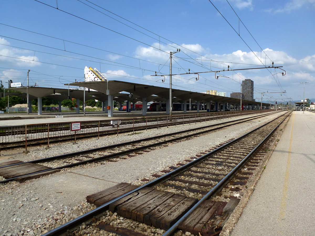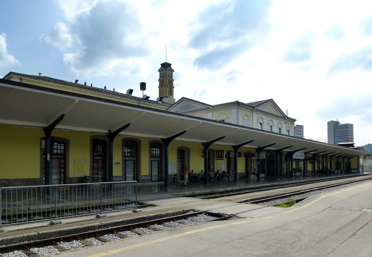 Ljubljana, der Hauptbahnhof von der Straßenseite, Juni 2016
