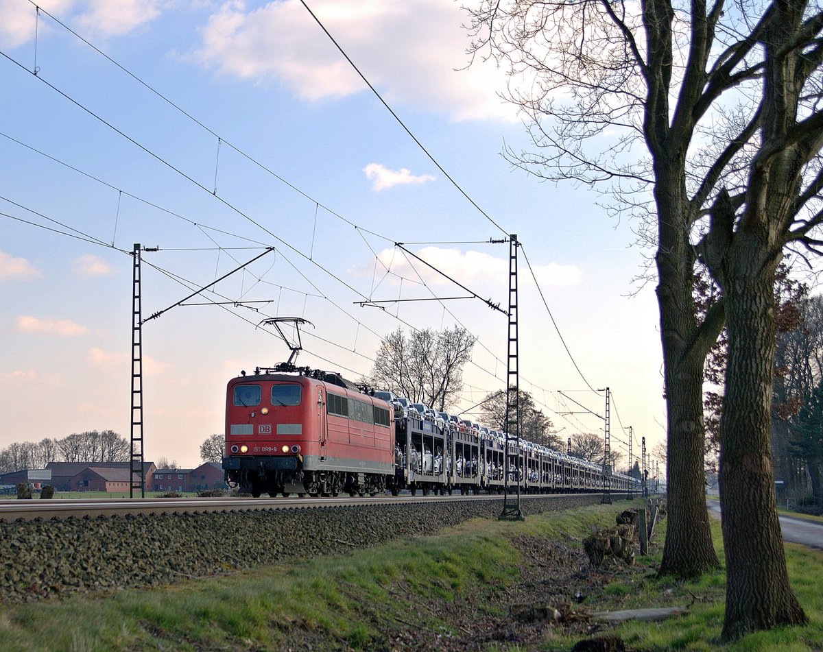 DB Cargo 151 099 mit Autotransportzug in Richtung Bremen (Diepholz, 16.03.16).