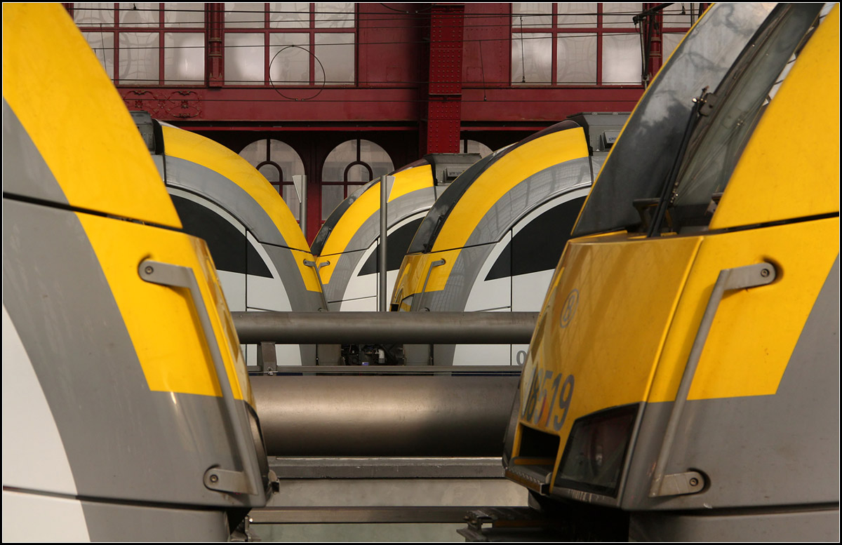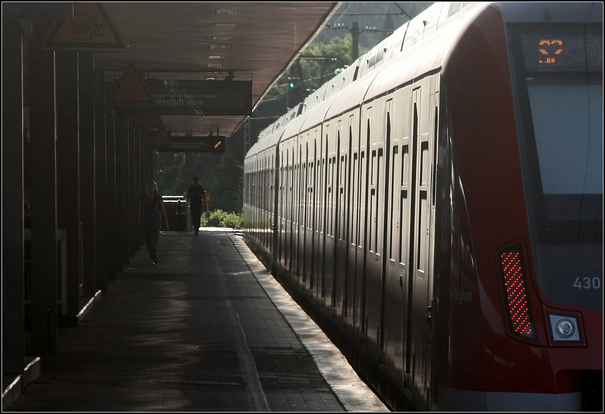 Die späte Nachmittagsonne stand hier gerade so, dass die Sonne zwischen der Dachkante und dem S-Bahnzug die Bahnsteigkante in helles Licht tauchte, was sich wiederum an der Unterkante des Zuges spiegelte. S-Bahnzug der Baureihe 430 in Stuttgart-Bad Cannstatt.