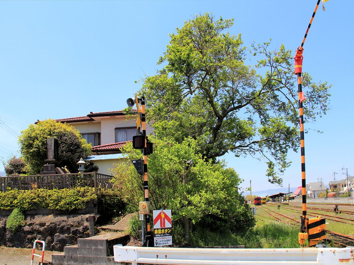 Die beiden gefangenen Züge in Miyaji, von etwas weiter weg gesehen. Im Vordergrund der Bahnübergang (wann werden je wieder die Schranken schliessen?) mit den Sicherheitsknöpfen, um im Notfall die Züge zu stoppen, dahinter ein typisches örtliches Haus mit dem Familiengrab im Garten. 1.Mai 2016. HÔHI-HAUPTLINIE