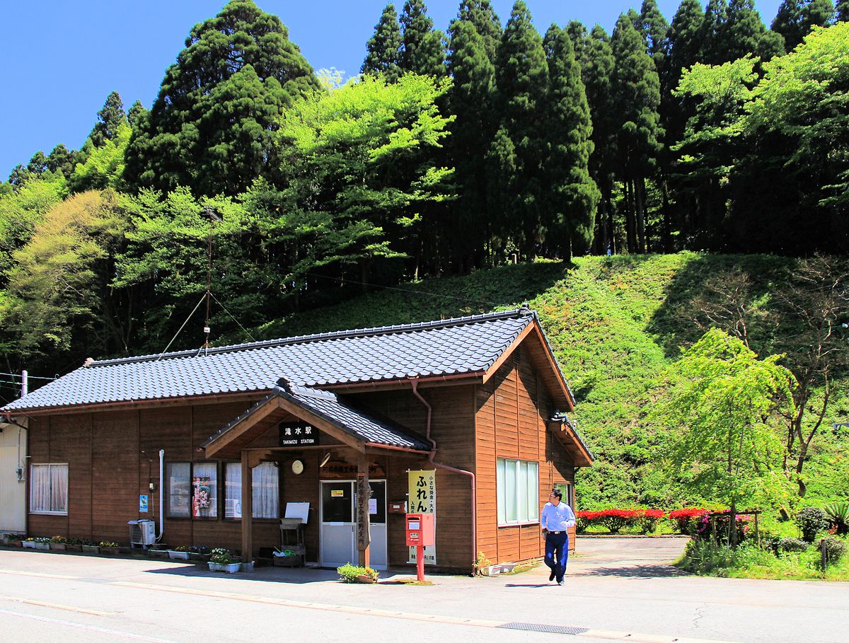 Die südliche der beiden Transversalen quer über Kyûshû ist jetzt durch Erdbeben zerstört; ein kleiner Ersatzbus fährt die Strecke ab, und bei jeder Station rast der Busfahrer um die kleinen Gebäude herum, damit ja kein Fahrgast dort irrtümlicherweise auf einen Dieseltriebwagen wartet, der nie kommen wird. Takimizu, 1.Mai 2016. HÔHI-HAUPTLINIE