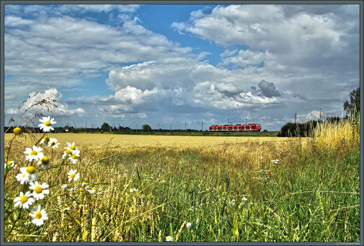 Ein 425 der S-Bahn Mittelelbe durchquert am 03.07.2016 bei sommerlichen Wetter die Felder unweit des Bahnhofs Angern-Rogätz. Ziel der S1 ist der Bahnhof Bad Salzelmen in Schönebeck.