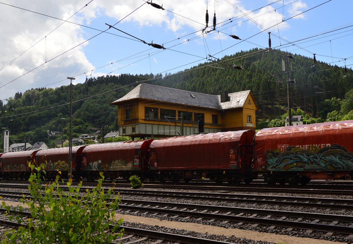 Eine fast unendlich scheinende Reihe von Tragwagen mit Plane stehen vor dem alten Reiterstellwerk des Bahnhof Finnentrop,2.7.2016
