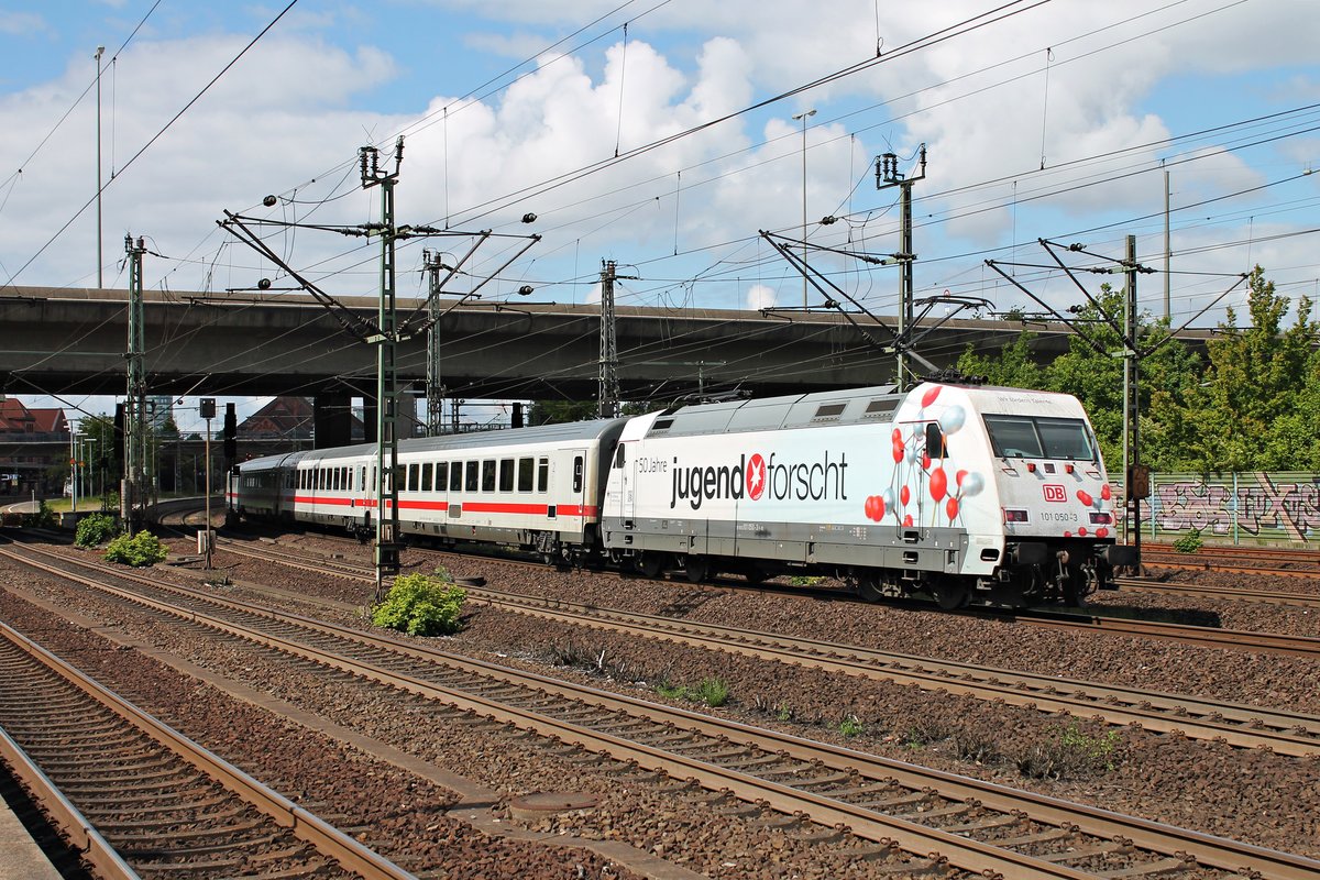 Nachschuss auf 101 050-3 "50 Jahre jugen forscht" am 26.05.2015, als sie einen IC in den Bahnhof von Hamburg Harburg aus Richtung Süden schob.