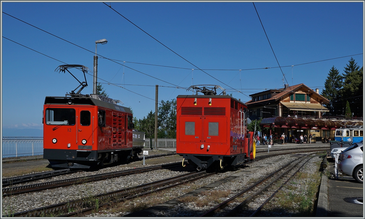 "Rote Klötze" in Glion: Links die Hem 2/2 12 als Schiebelok für einen Gepäckzug Richtung Rochers de Naye und recht wartet die X Rot N° 4 auf den nächsten Winter.