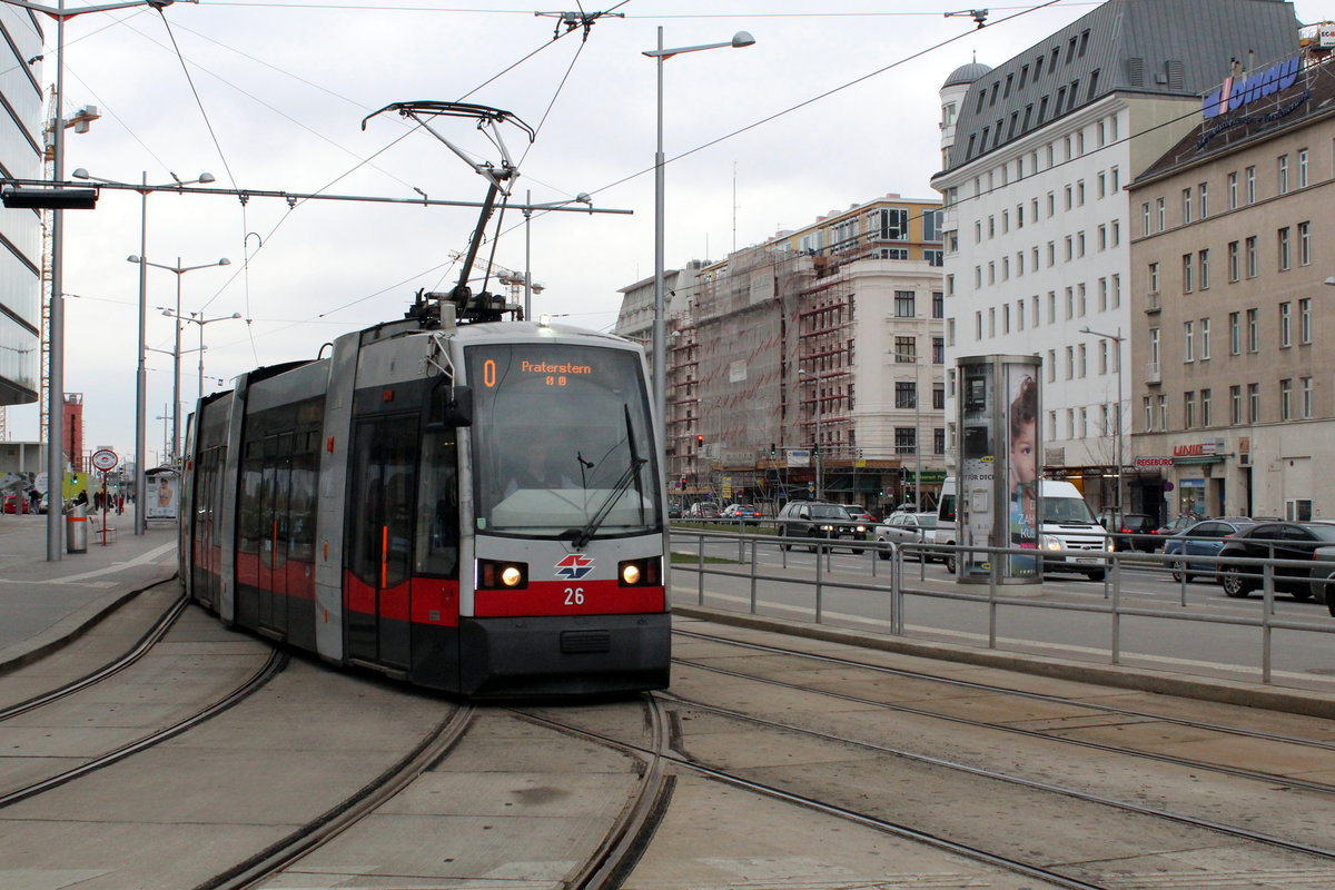 Wien Wiener Linien SL O: Am 21. März 2016 erreicht der ULF A 21 die Endstation am Praterstern in Wien-Leopoldstadt.